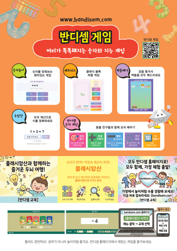 가정 통신문으로 사용하실수 있습니다 페이지 정보 작성자 최고관리자 작성일26-03-28 17:20 조회1회 댓글0건 관련링크 다음글 목록 본문 반디셈 게임과 플래쉬암산을 가정에서 사용할수 있도록 홍보용으로 만들어 보았습니다 댓글목록 등록된 댓글이 없습니다. 다음글 목록